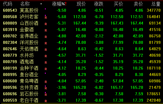 酒类股今日大幅下挫,莫高股份盘中一度跌停,收盘跌9.5%;泸州老窖、山西汾酒、金徽酒跌超5%,贵州茅台、五粮液跌超3%。