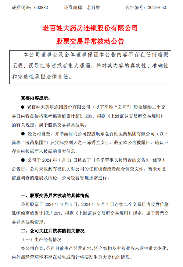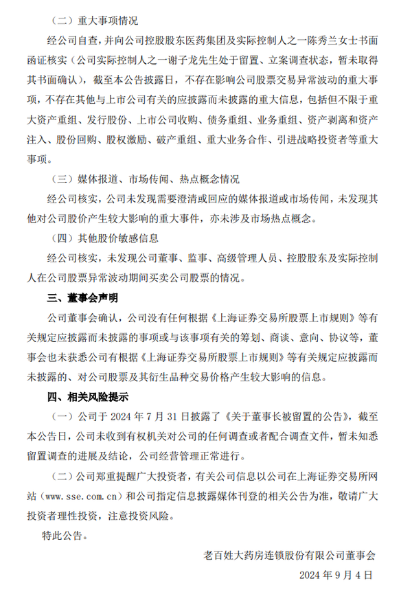 老百姓发布异动公告,公司未发现需要澄清或回应的媒体报道或市场传闻,未发现其他对公司股价产生较大影响的重大事件,亦未涉及市场热点概念。经公司自查,并向公司控股股东医药集团及实际控制人之一陈秀兰女士书面函证核实(公司实际控制人之一谢子龙先生处于留置、立案调查状态,暂未取得其书面确认)。