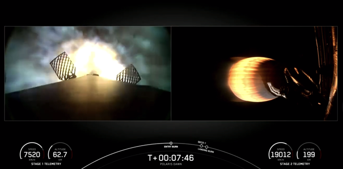 发射后,火箭一二级成功分离。火箭第一级成功降落在大西洋上的无人回收船上。发射12分钟后,飞船与火箭顺利分离,继续飞向太空。