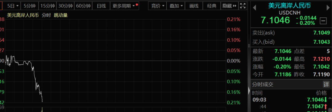 值得一提的是人民币的走势。离岸人民币兑美元北京时间04:59报7.1190元,较周三纽约尾盘涨103点。今天早盘,人民币再度直线拉升,幅度一度扩大至140点以上,并突破7.11。