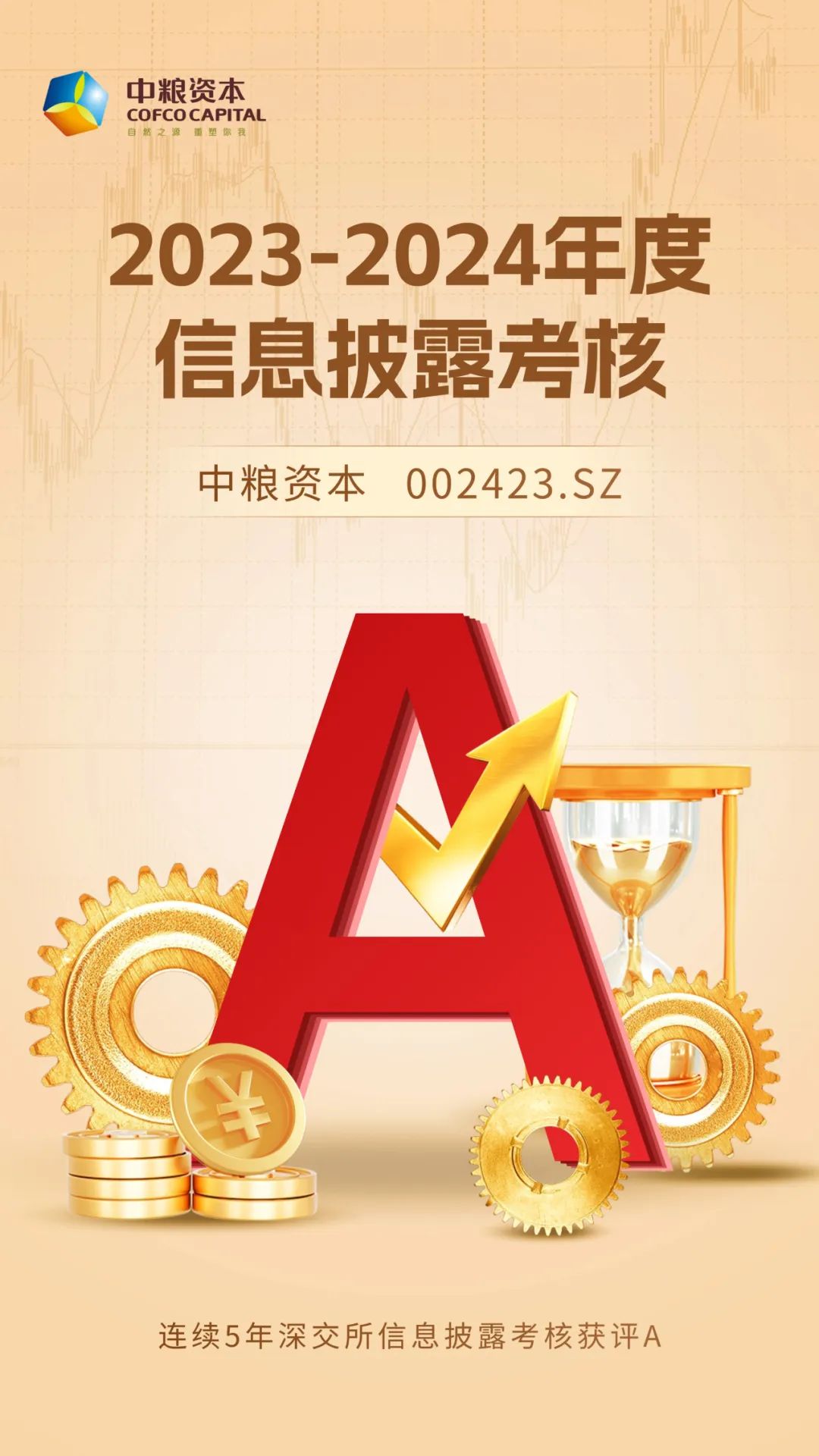 10月11日,深圳证券交易所(以下简称“深交所”)公布主板和创业板上市公司的2023-2024年度信息披露考核结果。中粮资本控股股份有限公司(以下简称“中粮资本”,002423.SZ)连续5年获评“A”。