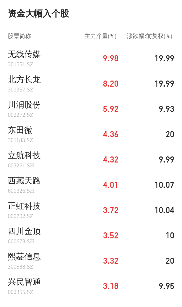 高新发展10月14日主力(dde大单净额)净流入2.88亿元,涨跌幅为10.01%,主力净量(dde大单净额/流通股)为2.77%,两市排名16/5101。