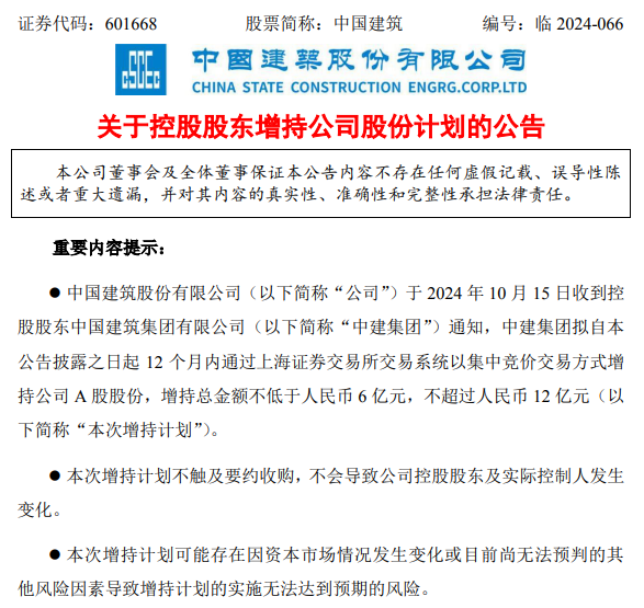中国建筑公告,公司控股股东中建集团拟自公告披露之日起12个月内通过上海证券交易所交易系统以集中竞价交易方式增持公司A股股份,增持总金额不低于6亿元,不超过12亿元。本次增持不设定价格区间,将根据对公司股票价值判断及二级市场波动情况实施增持计划。