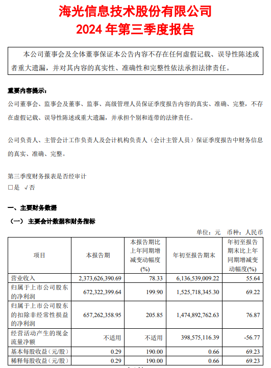 海光信息公告,2024年第三季度公司实现营业收入23.74亿元,同比增长78.33%;归属于上市公司股东的净利润为6.72亿元,同比增长199.9%。