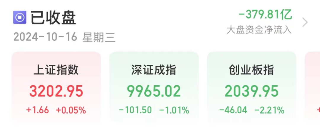 10月16日,A股三大股指全天震荡,沪指走势相对较强。截至收盘,上证指数报3202.95点,上涨0.05%。深证成指、创业板指分别收跌1.01%和2.21%。