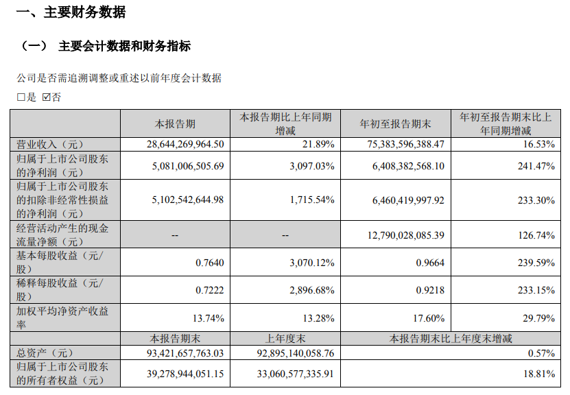 温氏股份(300498)10月22日晚间披露三季报,公司第三季度营业收入为286.44亿元,同比增长21.89%;归属于上市公司股东的净利润为50.81亿元,同比增长3097.03%;基本每股收益0.76元。