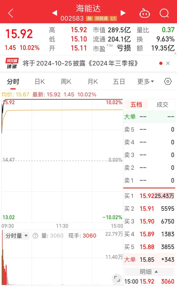 10月23日,海能达再次开盘不久即涨停,当天收盘股价报15.92元/股。值得一提的是,海能达将于10月25日发布三季报,披露具体财务数据。