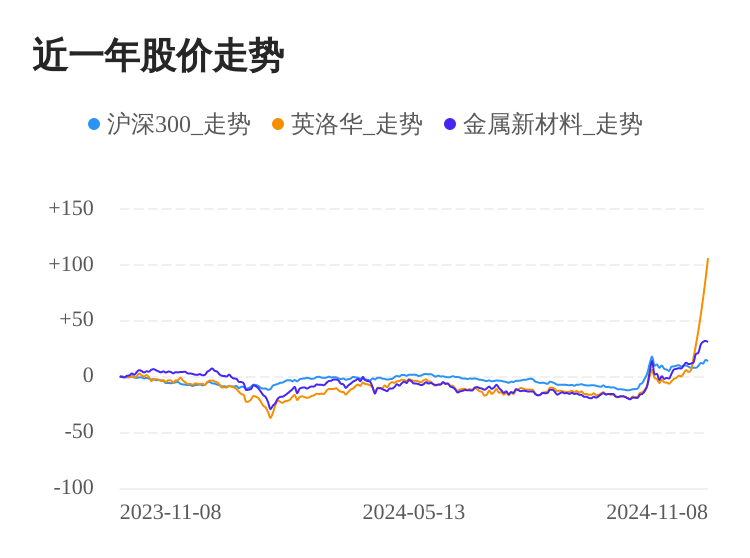 11月08日,英洛华股价大涨。截至今日收盘,英洛华上涨10.03%,收盘价为13.27元,收盘价创历史新高。