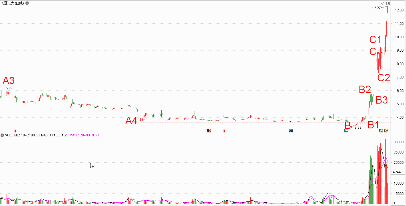 从后面的走势看,我们的预判得到了精彩的应验。我们预判的次日,也就是B3线那天,该股再次涨停并有效突破365线,而后连续一字板+T字板拉升,前后一口气拉了四个板才打住。到了C柱的时候,终于高开低走收出了一根近乎跌停的高量阴线。