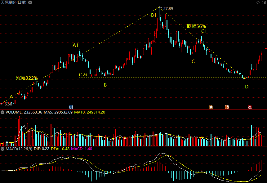 1、 该股自A点启动,在B点经过加油后至B1点见顶,累计涨幅 322%。其中,第一波拉升幅度188%,第二波拉升幅度120%,都达到了翻倍的空间,反观第二波下面的量能却没有有效放大,因此,判断该股内在流淌着牛股的血夜,具有牛股基因。