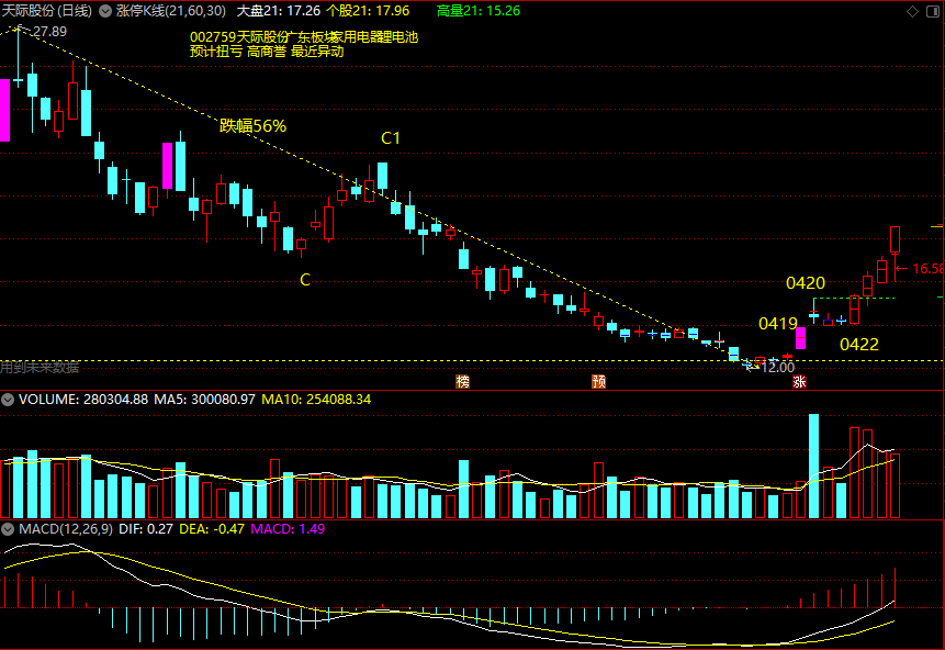 1、0419涨停板之后,次日收出一个十字星,当天收出一根近期的绝对高量,这再次引起我的强烈关注,核心在于2点:一是当天是高量,高量就是主力所为,就是异动;二是当天的收盘价还是在涨停板的上方。可以看做是假阴真阳,洗盘性质明显。