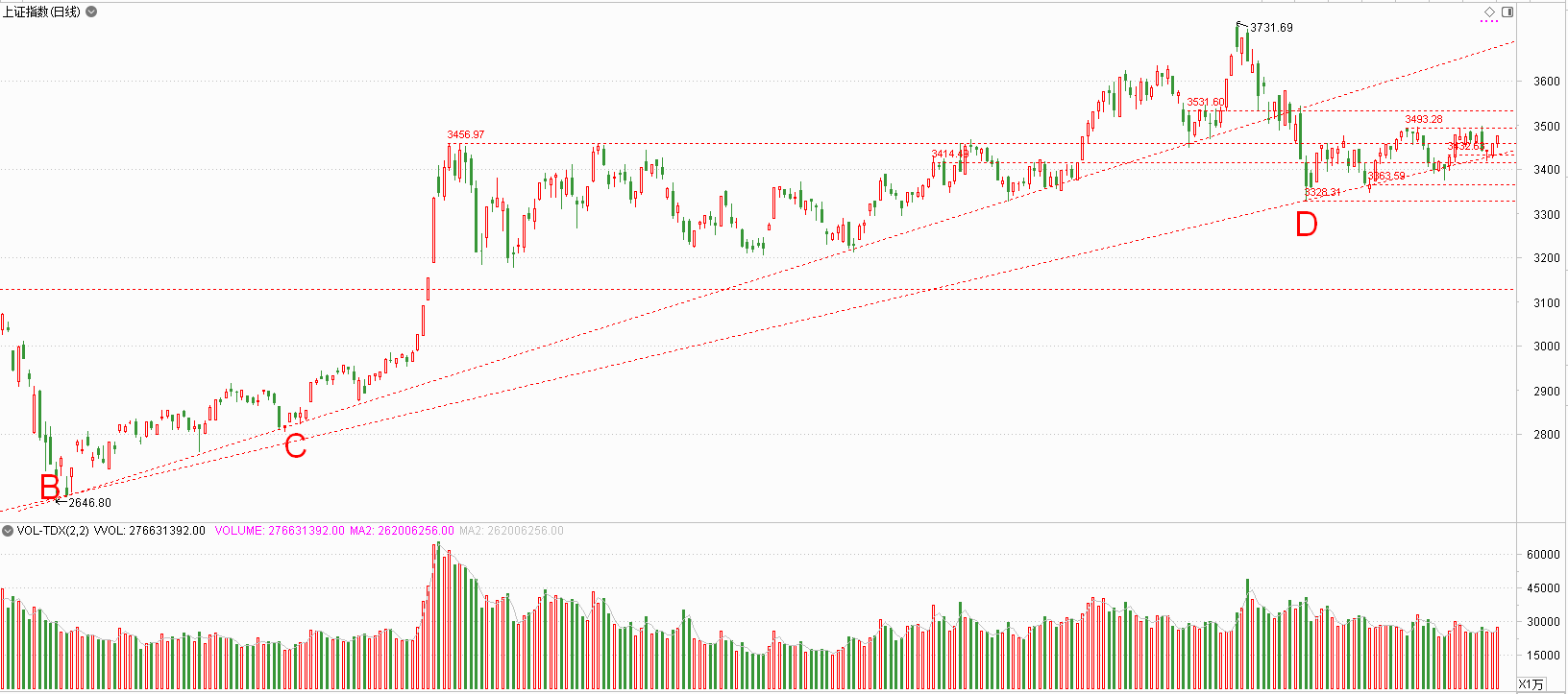 从目前看,大盘能否站稳3456、有效突破3531至关重要,要是能,就会向上,要是不能,就还会向下震荡。但我个人仍然认为跌破BD烽火线或3414的可能性比较小,大盘大概率是以BD烽火线为支撑,小幅震荡,波涛向上。所以在这种情况下,我们精做个股就行。