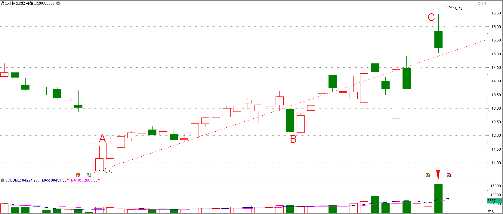 从图3-5通合科技的走势中我们可以看到,A柱之后,股价一路震荡向上,到了C柱时,突然蹦出一根一字板!这时候,是不是很多股民都像年少的我一样喜不自禁?是的,肯定是的。因为你从一字板脚下的成交量就可以看出,没有多少人愿意在这个位置上扔掉筹码的,就像我当初不愿意在2.2元扔掉玫瑰茄一样,当然期待着股价天天涨停往上拉!