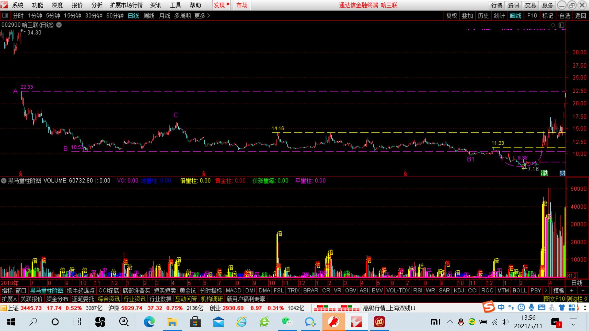3、综合以上来看,从B点开始的走势符合海底捞的形态,按照特训班学习的内容,海底捞是很有质量的筑底形态。主力可能已经完成建仓。