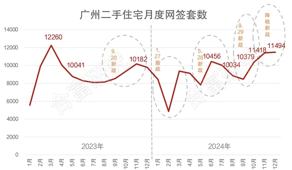 政策落地后,广州二手房复苏势头持续,2024年四季度二手住宅网签连续3个月破万,其中12月份的二手住宅网签数量为11494宗。该网签量成为去年年内单月成交最高成绩,同时也是年内第5次突破万套。