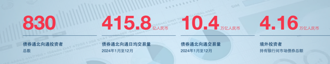 作为全球第二大债券市场,中国债券市场深受全球投资者关注。债券通则进一步提升了国际投资者参与中国债券市场的兴趣。来自债券通公司的数据显示,截至2024年底,债券通“北向通”共有830家投资者。2024年1月至12月债券通“北向通”的日均成交额为415.8亿元人民币,全年“北向通”的交易额为10.4万亿元人民币。截至2024年底,境外投资者持有银行间市场债券总额为4.16万亿元。