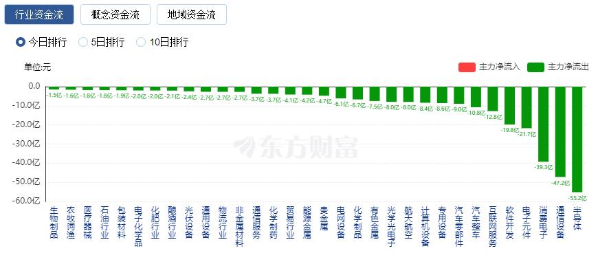 净流出方面,半导体、通信设备、消费电子等净流出排名靠前,其中半导体净流出55.16亿元。