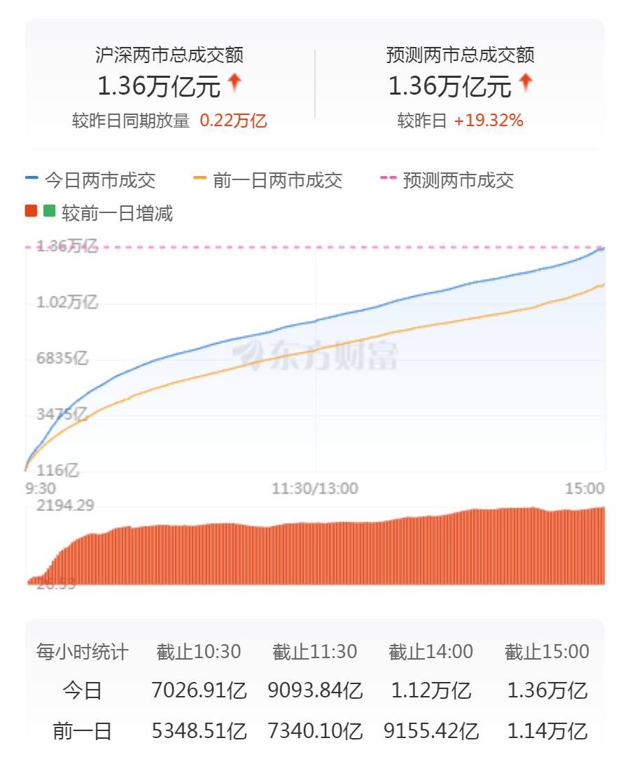 A股三大指数今日冲高回落,截止收盘,沪指涨0.51%,收报3230.16点;深证成指跌0.49%,收报10176.17点;创业板指跌0.37%,收报2093.31点。沪深两市成交额达到13553亿元,较昨日放量2194亿。