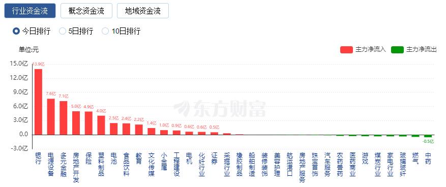 行业资金流向:13.93亿净流入银行