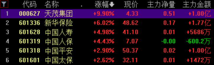 保险板块大涨,天茂集团涨停,新华保险、中国人寿、中国人保等涨幅居前。