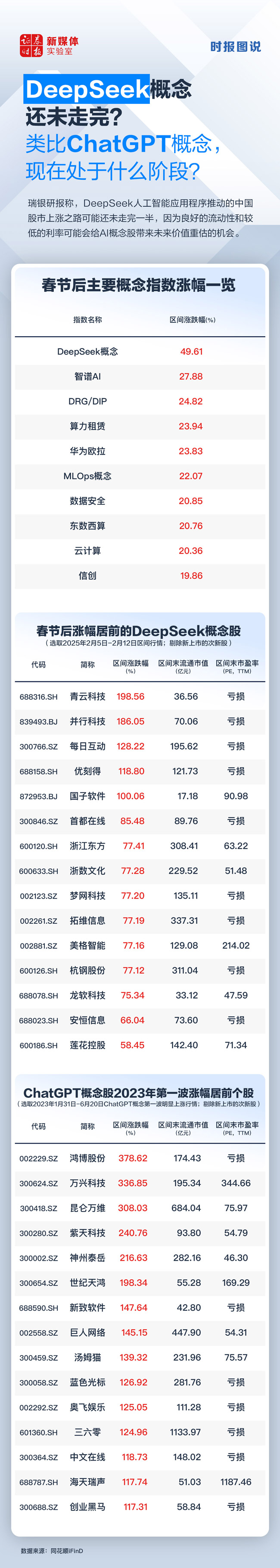 瑞银研报称,DeepSeek人工智能应用程序推动的中国股市上涨之路可能还未走完一半,因为良好的流动性和较低的利率可能会给AI概念股带来未来价值重估的机会。类比2023年横空出世的ChatGPT概念,DeepSeek概念现在处于什么阶段?一起来看图。