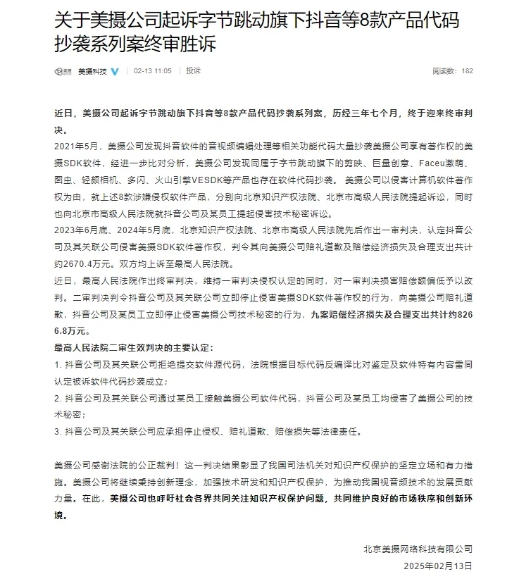 2月13日,美摄科技官微发布声明称,美摄公司起诉字节跳动旗下抖音等8款产品代码抄袭系列案,历经三年七个月,近日迎来终审判决。