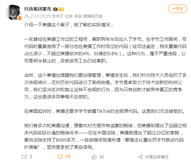 2月13日,微博认证为“抖音集团副总裁”的账户抖音李亮回应美摄起诉案: