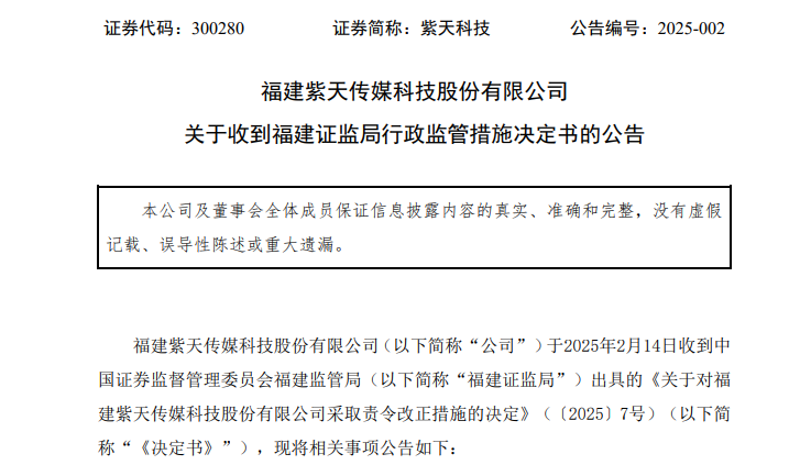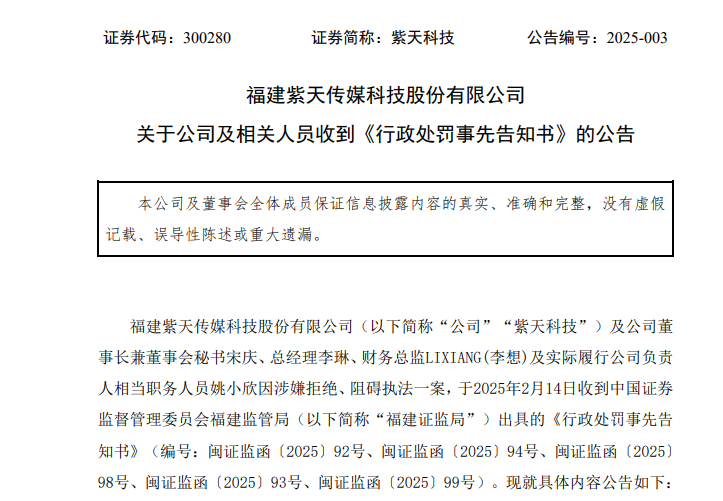 2月14日晚,紫天科技(300280)公告,公司收到福建证监局《行政处罚事先告知书》和《行政监管措施决定书》。公司及相关人员因多项违规行为,面临监管部门严厉处罚。此次处罚不仅涉及高额罚款,总计罚款金超500万元,更有市场禁入的严厉举措。