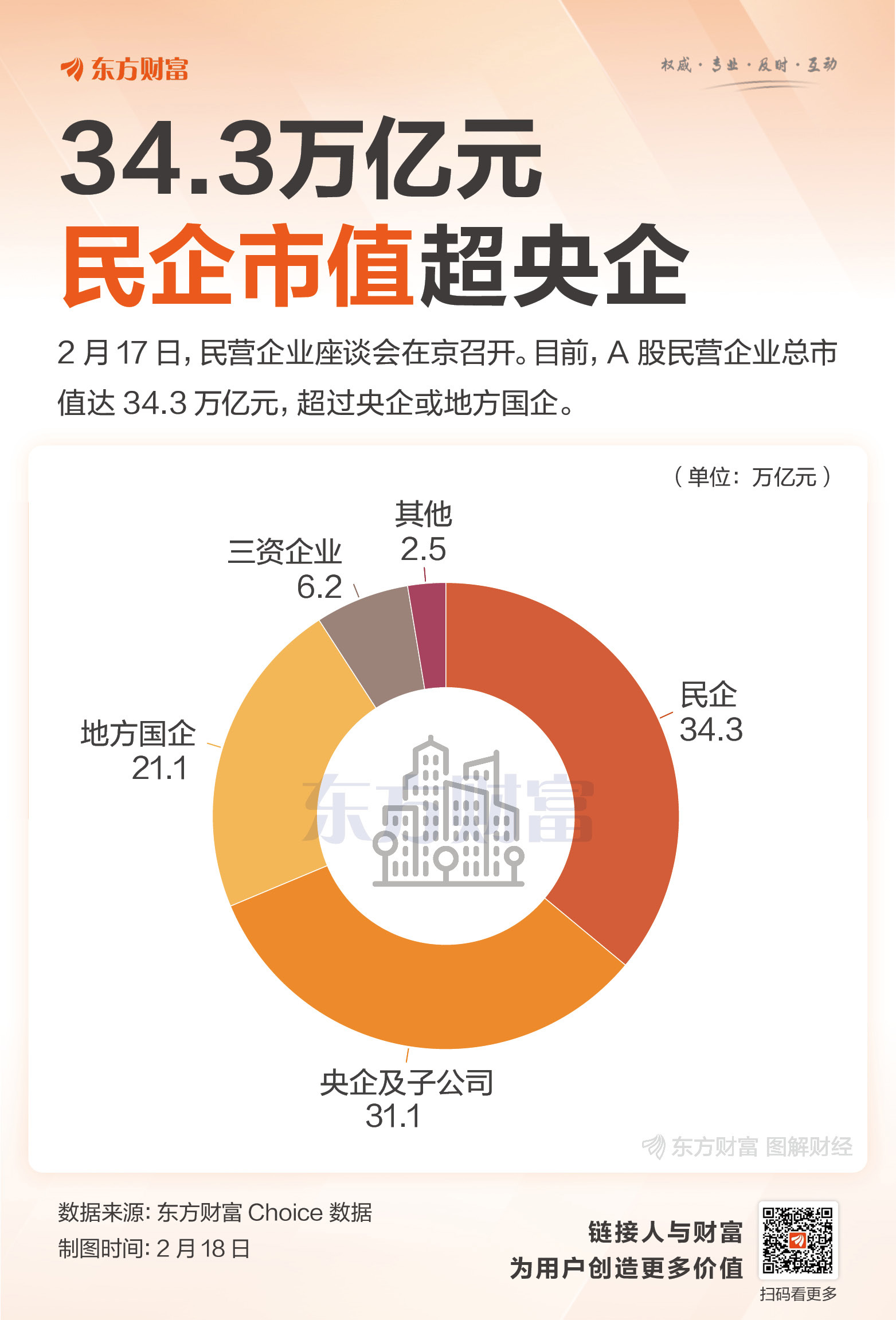 当前民营企业发展态势良好,东方财富Choice数据显示,在A股上市的民营企业市值达34.3万亿元,超过央企及子公司的31.1万亿元,也超过地方国企的21.1万亿元。