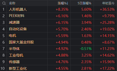 结果而言,“硬科技”方向再次引领市场,人形机器人概念单日大涨8.35%;业务有交叉关系的PEEK材料、减速器、自动化设备、工业母机等板块均涨幅居前。半导体板块同样走出“阳包阴”的强势表现。