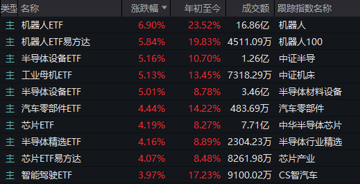 场内ETF方面,在人形机器人概念的强势表现下,主题类产品中,机器人ETF的涨幅遥遥领先。