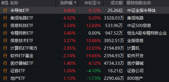 数据显示,在行业类ETF中,半导体、集成电路、信息技术、信息科技等相关产品今天同样涨幅领先。