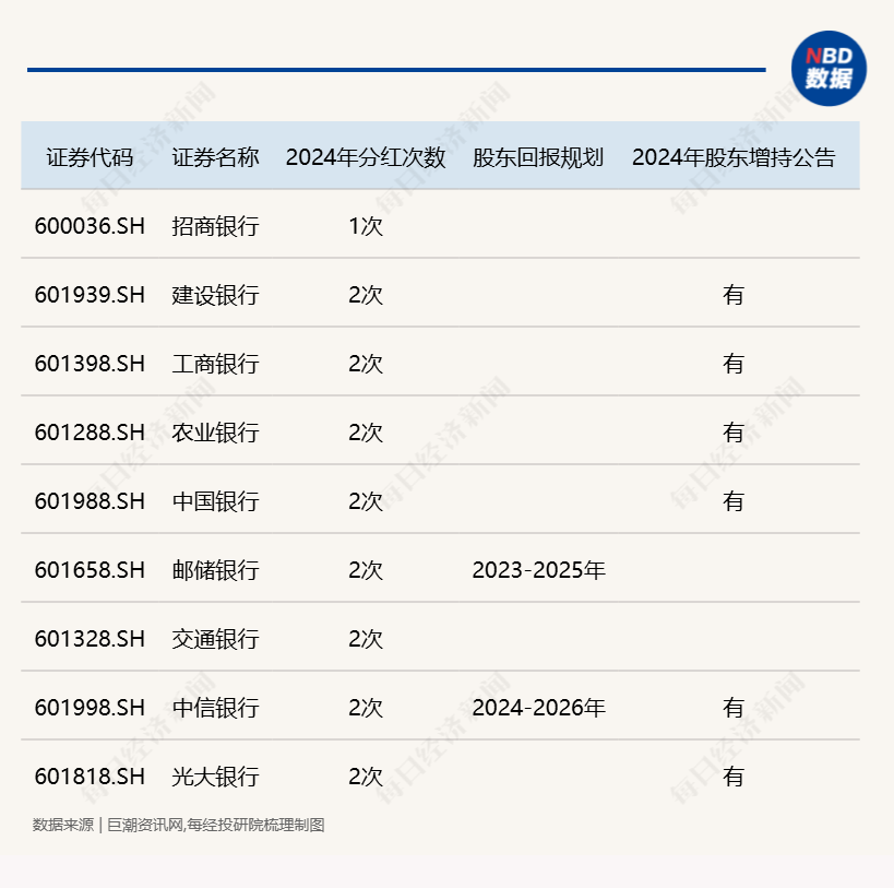分红方面,2024年,除招商银行外,其余8家银行均进行了2023年度分红和2024中期分红,有6家银行的分红比例均在30%(含)以上;其中邮储银行、中信银行还发布有股东回报规划。而招商银行在2024年进行了2023年度分红,分红比例为35.01%。另外,工商银行、农业银行、中国银行、建设银行、中信银行和光大银行等六大行,在2024年都有控股股东增持本行股份的相关公告发布。