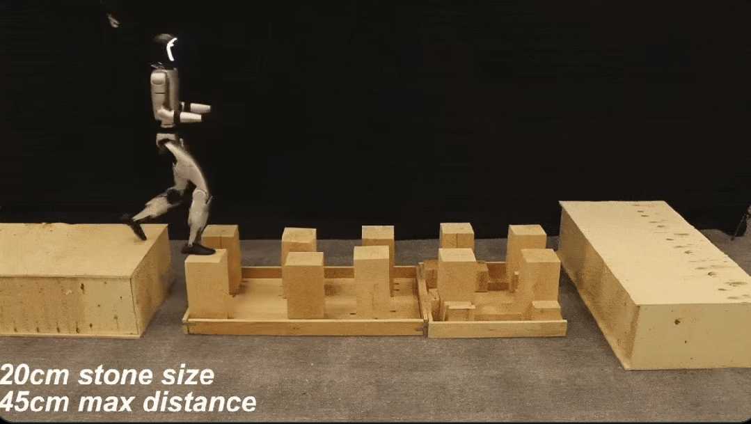 在演示中,G1能稳定地穿过多个约20厘米宽的面积狭小、间距不一的踏脚石,甚至可以倒着行走。