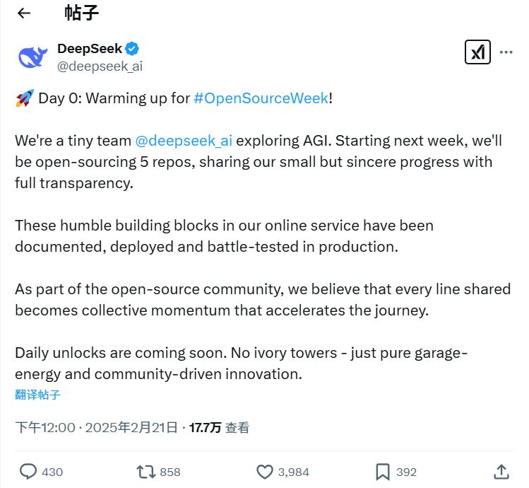 2月21日,DeepSeek在其官网X账号宣布,接下来一周,会陆续开源5个代码库,并进一步分享新的进展。