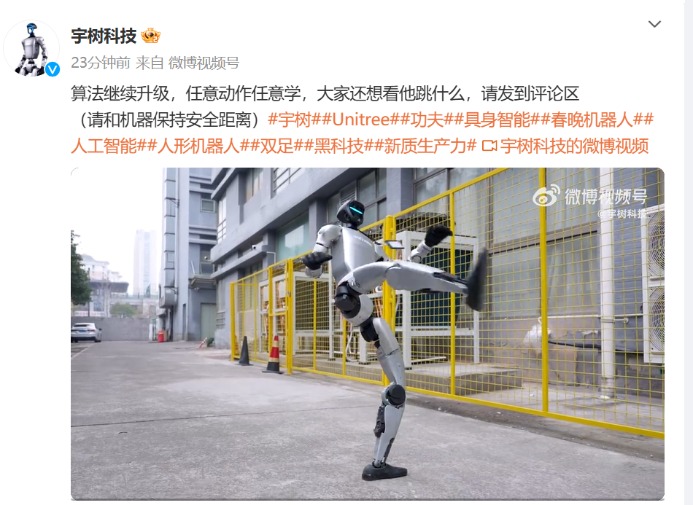 2月25日,宇树科技更新一则视频,标题为“功夫BOT:宇树G1”,表示随着算法升级,任意动作任意学。视频显示,该机器人能够流畅地施展挥拳、旋踢等高难度武术动作。