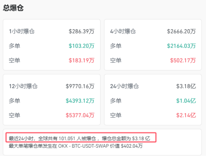 加密货币的剧烈波动,又导致不少人爆仓。coinglass数据显示,过去24小时内,加密货币全网合约爆仓人数超过10万人,爆仓金额超过3亿美元,其中空单爆仓超2亿美元。