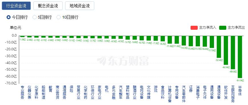 净流出方面,半导体、互联网服务、软件开发等净流出排名靠前,其中半导体净流出61.93亿元。