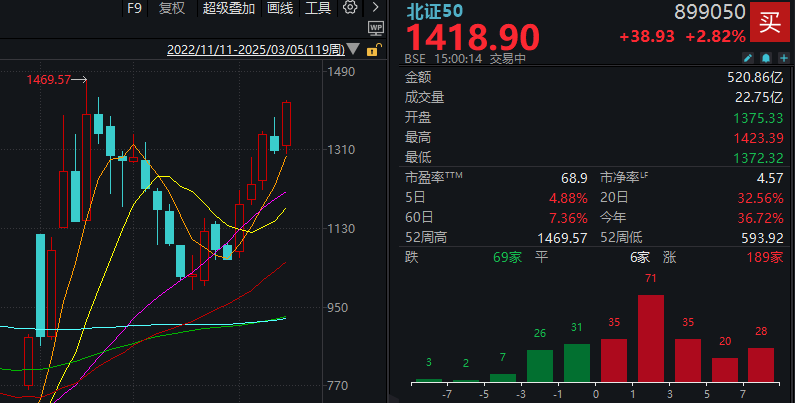 截至收盘,其年内涨幅高达36%,距去年11月8日的盘中历史高点,已相当接近。自春节以来,北交所的行情可谓量价齐升。