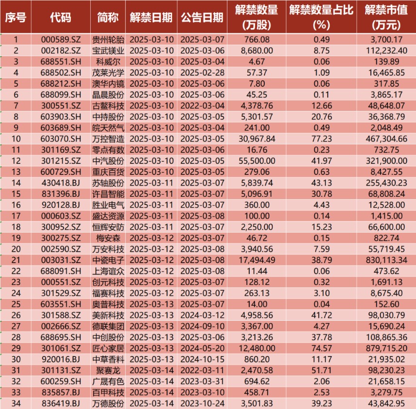 本周(3月10日到3月14日)A股市场将有34股解禁,按照最新收盘价计算,合计解禁市值达361.58亿元。匠心家居、中瓷电子解禁市值居前。从解禁比例来看,3股解禁比例超50%,分别是万控智造、匠心家居、聚赛龙。澳华内镜、科威尔、奥普科技的解禁比例较小,均不到0.1%。