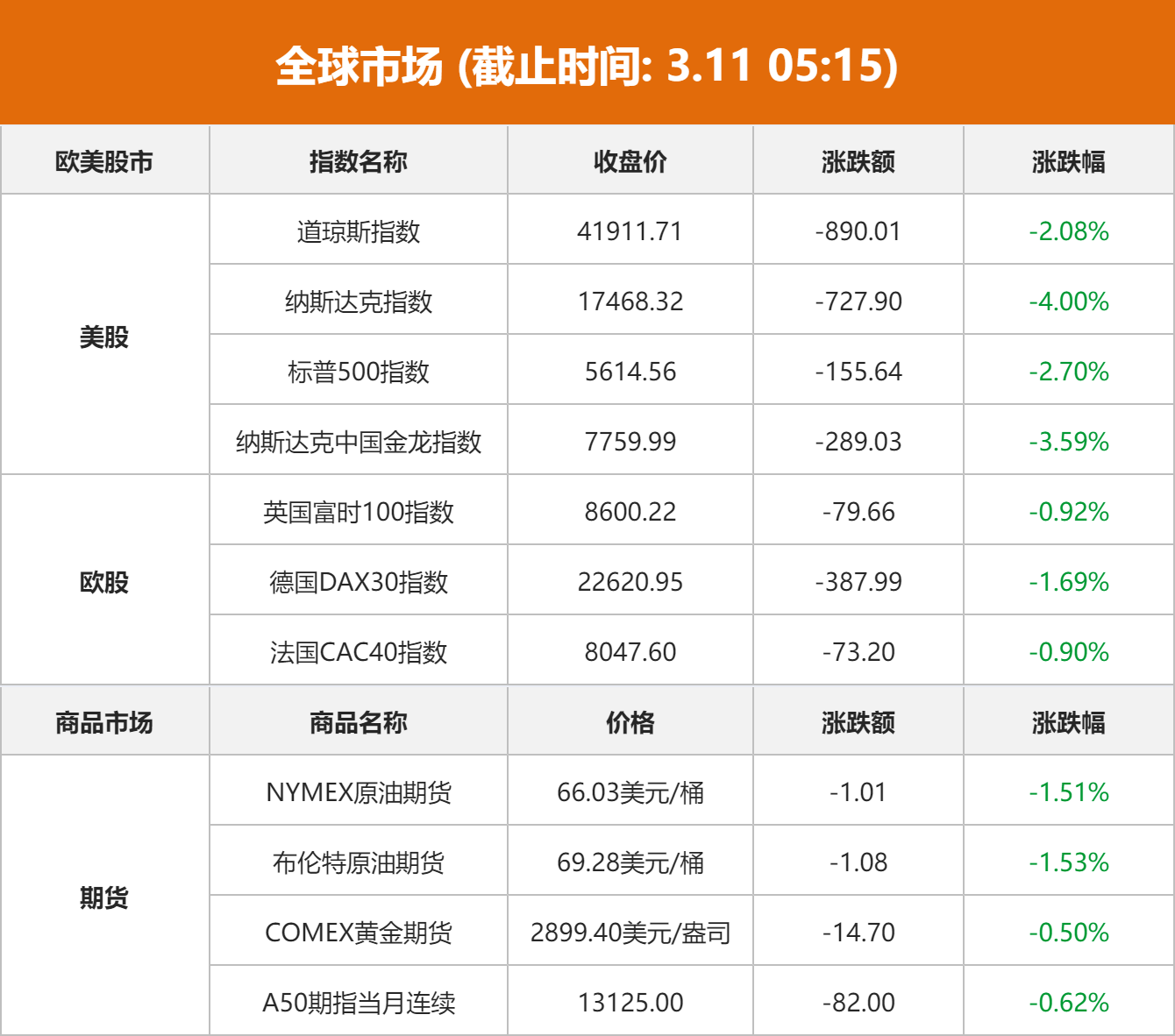 美股市场:美股三大指数集体收跌,美国经济衰退风险上升引发市场严重担忧。截至当天收盘,截至当天收盘,道琼斯工业平均指数比前一交易日下跌890.01点,收于41911.71点,跌幅为2.08%;标准普尔500种股票指数下跌155.64点,收于5614.56点,跌幅为2.70%;纳斯达克综合指数下跌727.90点,收于17468.33点,跌幅为4.00%。